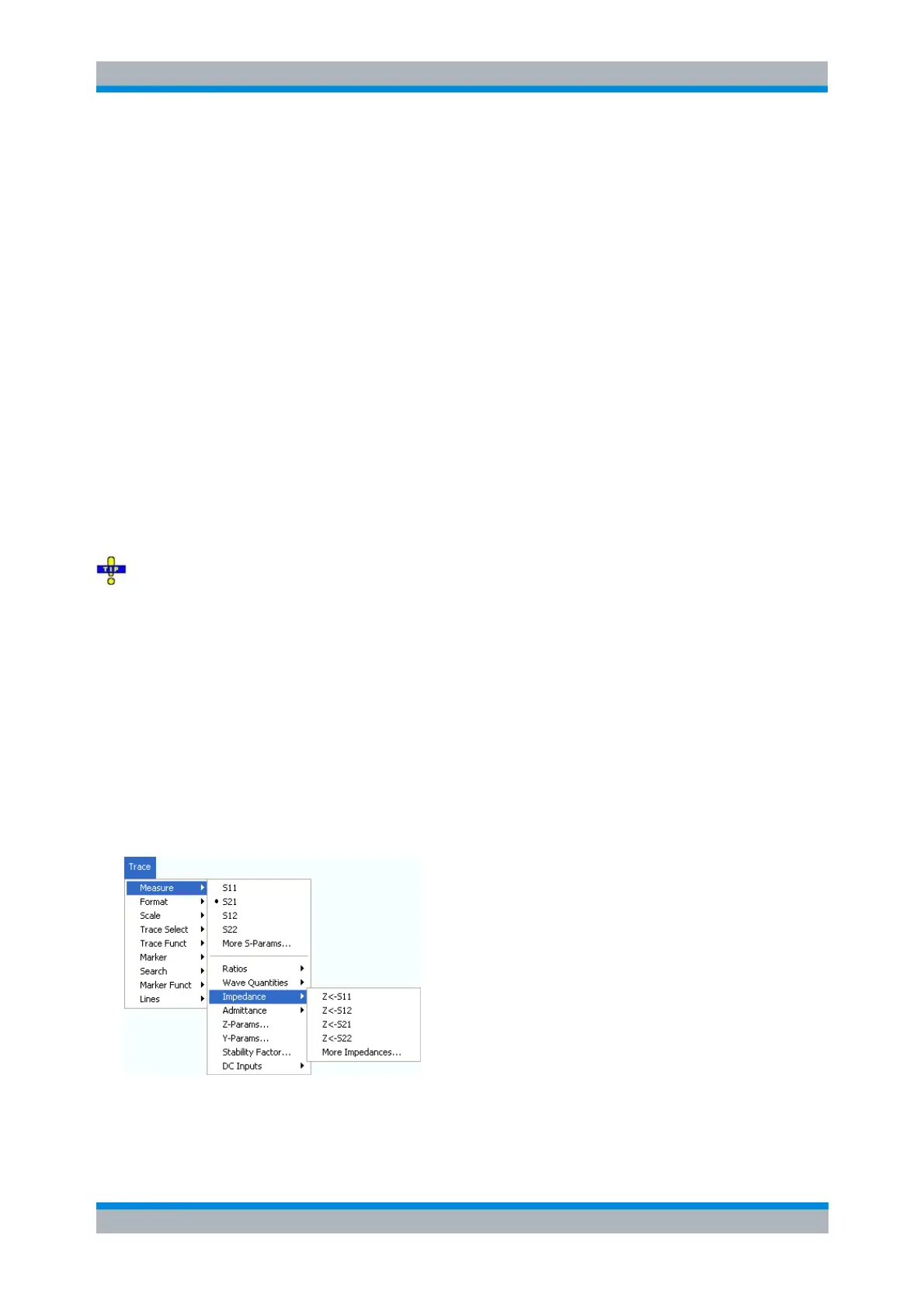 The Impedance submenu contains the functions to calculate converted impedances from the measured S-