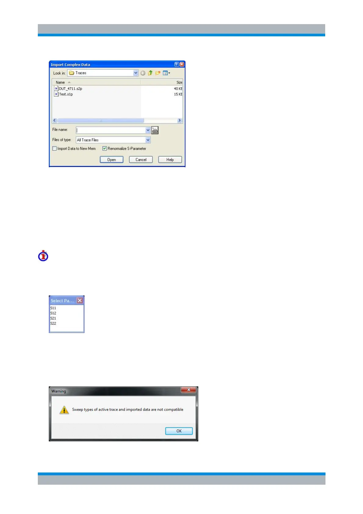 the imported data and of the active trace must be compatible. Compatibility means that the Sweep Type of