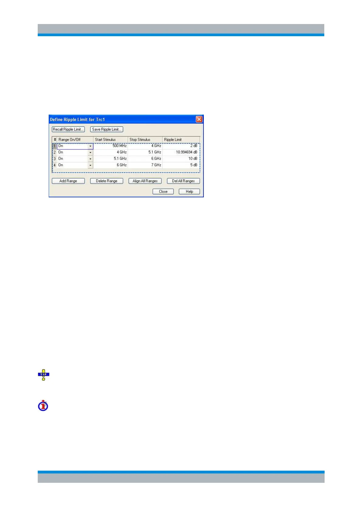 The Define Ripple Limit dialog contains a table to edit the individual ripple check ranges; see below. The