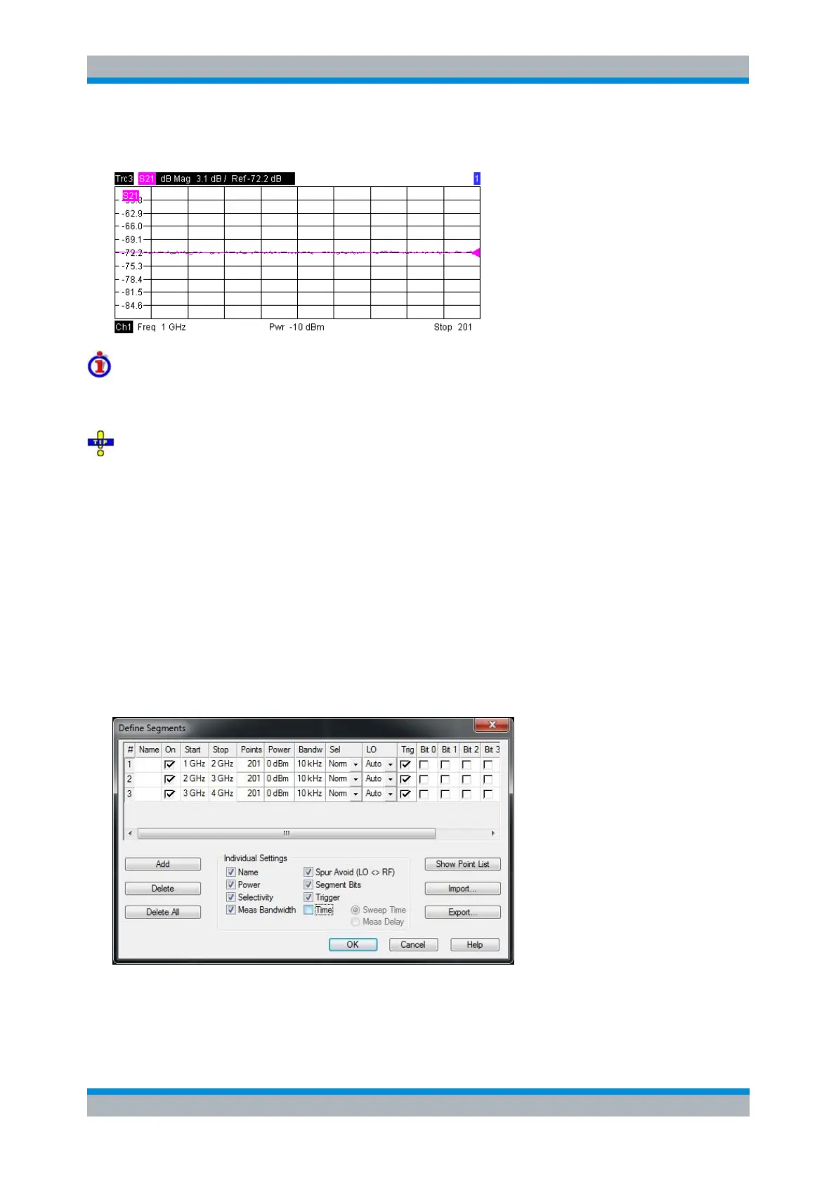 The Define Segments dialog contains a table to edit the individual segments of the sweep range. Sweep