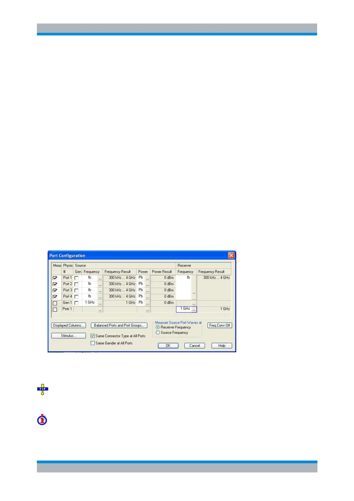 The Port Configuration dialog defines the properties of the test ports and configures the source signals
