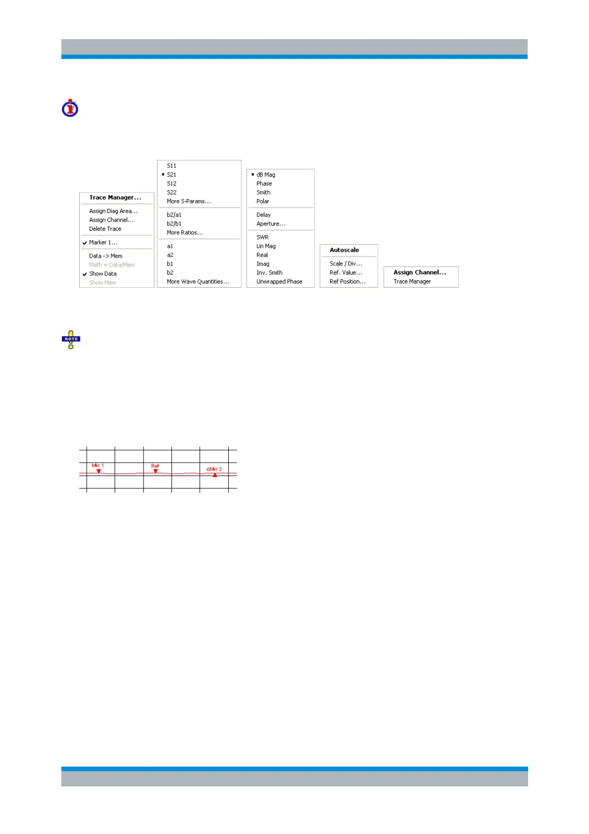 A right mouse click on the trace name, the measured quantity, and the format and scale section of the