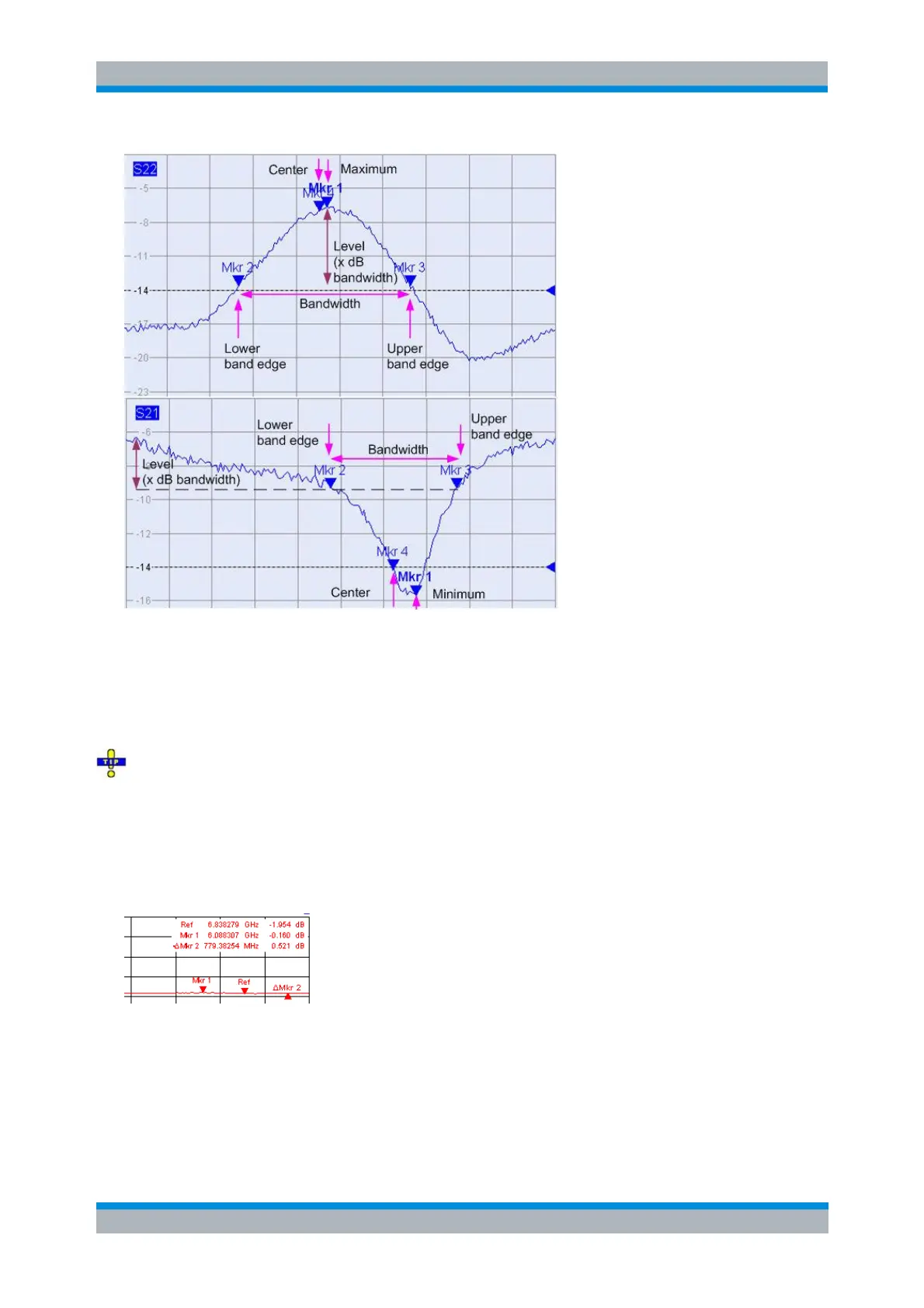 Mkr 2 and Mkr 3 indicate the lower and upper band edge where the trace value has decreased