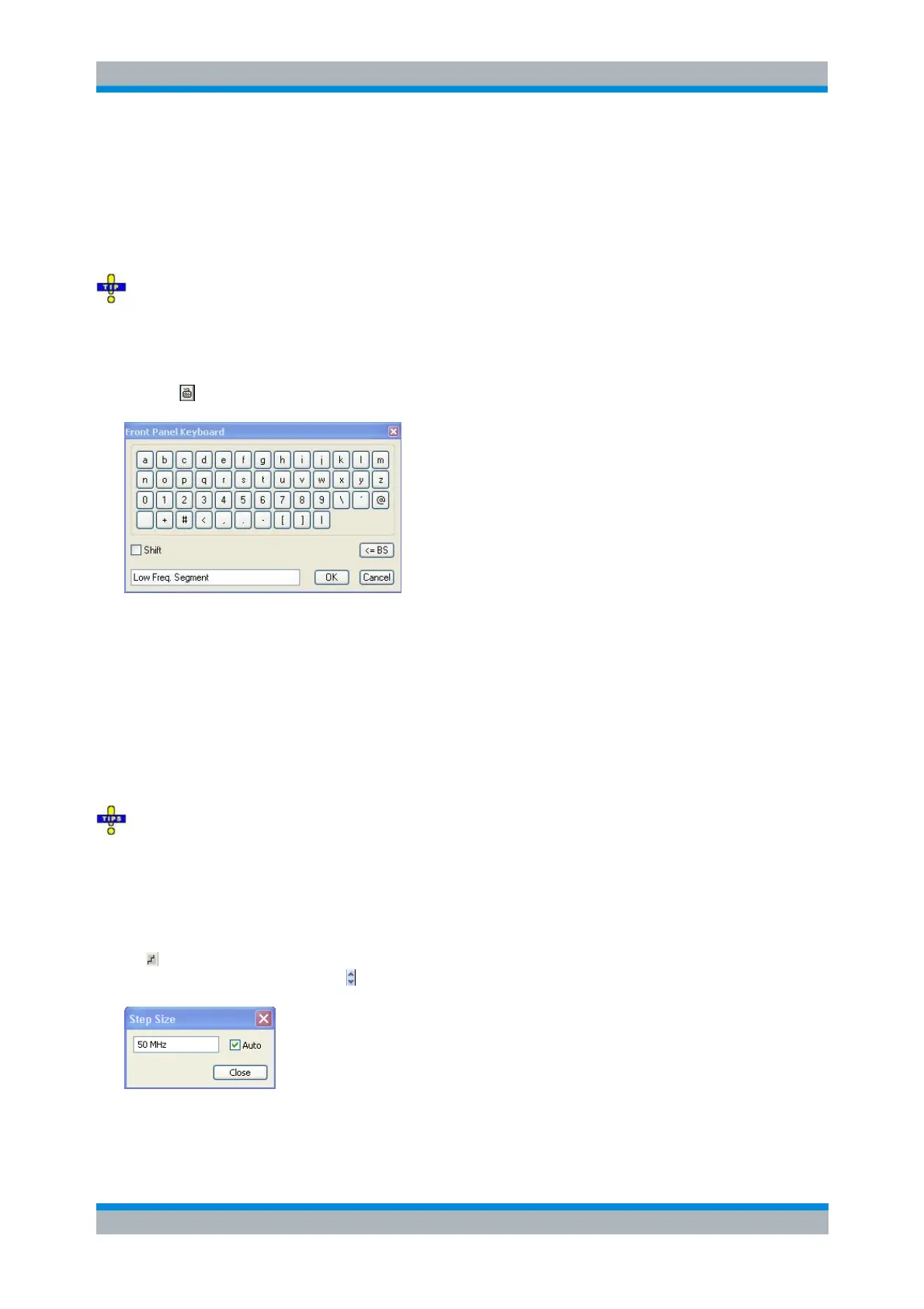Dialogs with immediate settings provide a Close button but no OK button. Example: Step Size