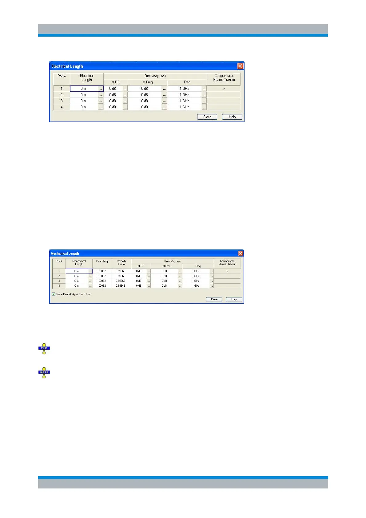 Opens a dialog to define length offset parameters for the physical test ports as mechanical lengths and
