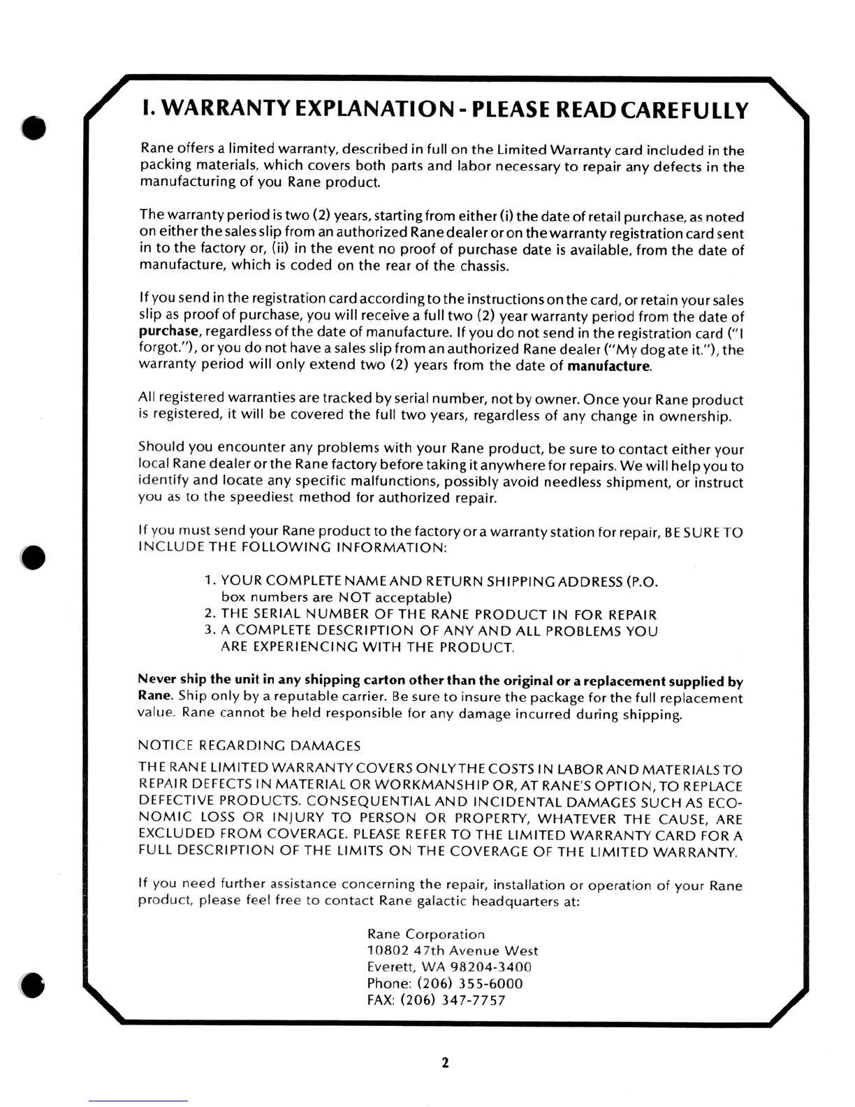 Rane AC 22 - Warranty Information