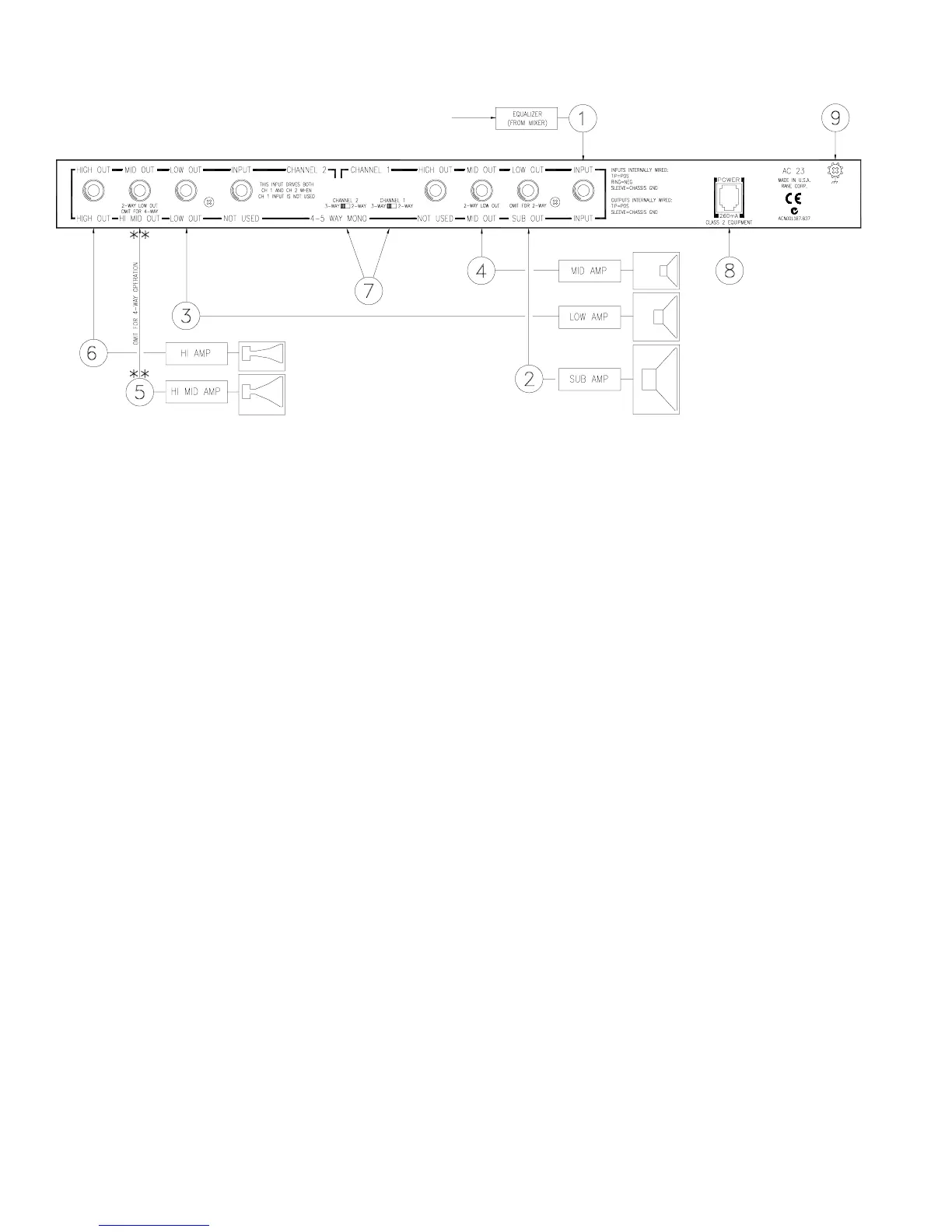 햶 Hl MID FREQUENCY OUTPUT (FOR MONO 5-WAY ONLY): Use this output only for Mono 5-Way applications.