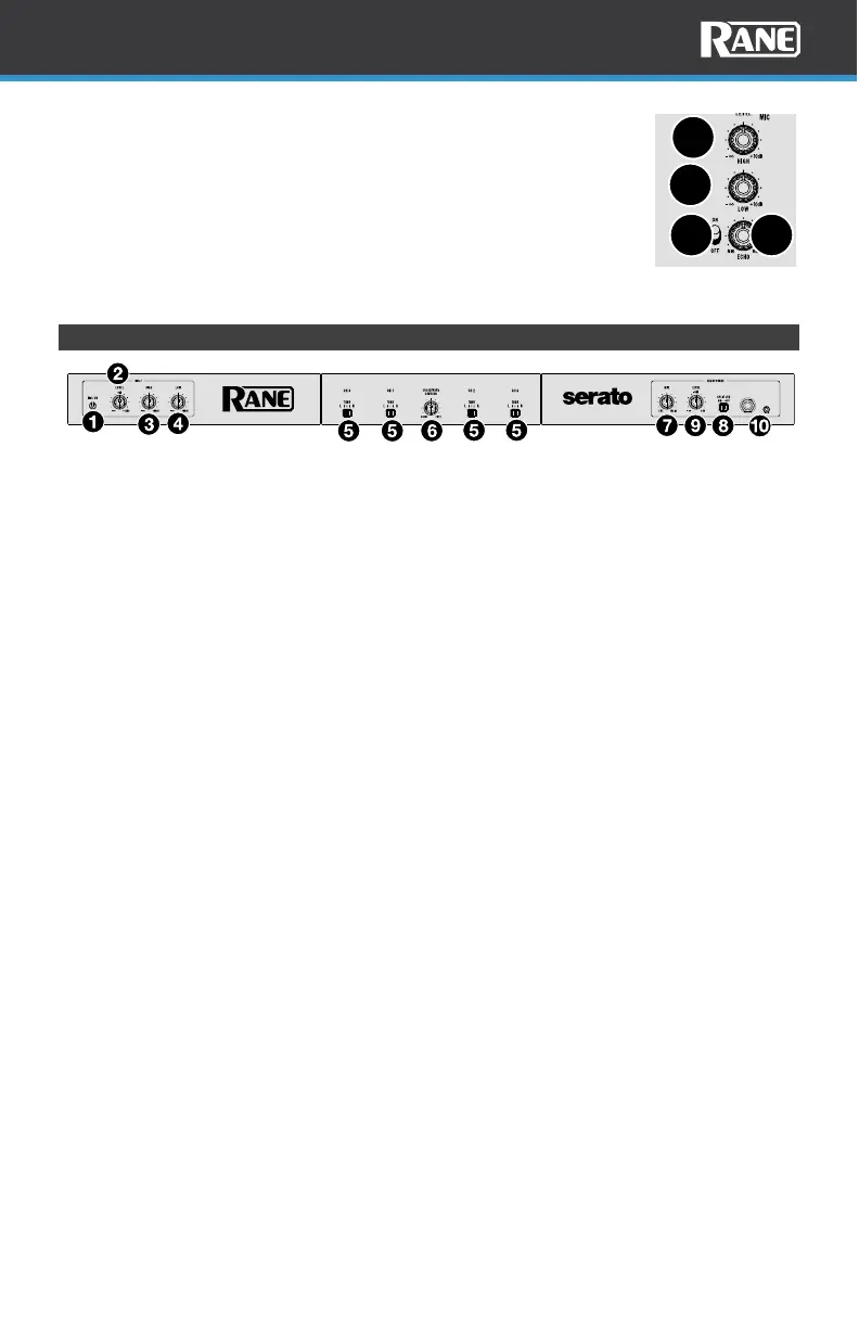 6. Crossfader Contour: Adjusts the slope of the crossfader curve. Turn the knob to