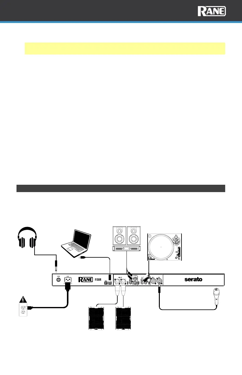 Connect audio input sources (microphones, turntables, etc.) to FOUR.