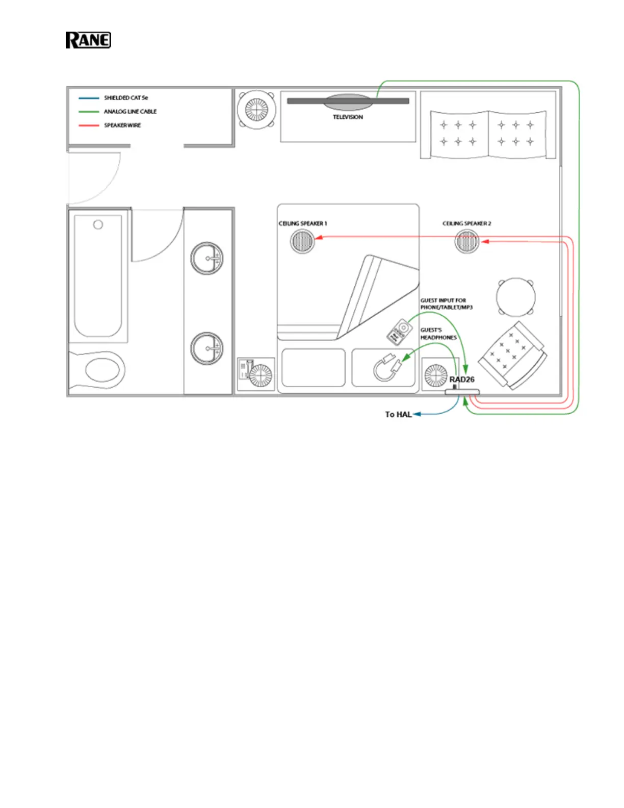 cable to the AUX input. The RAD26 can be configured so that inserting an AUX plug can override another music