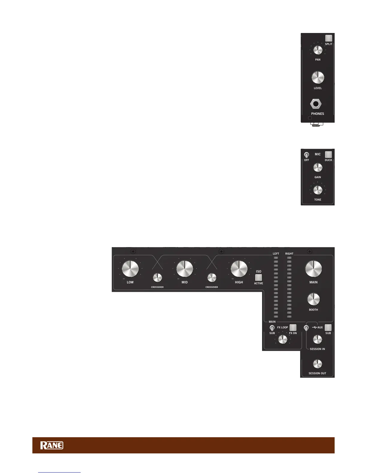 • Main, Booth and Session outputs have independent Level controls; range is off to 0 dB.
