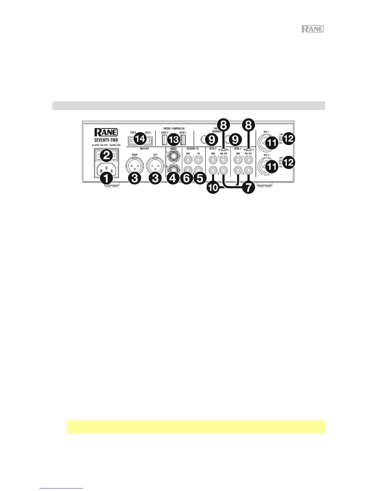 1. Entrada de alimentación: Con el Seventy-Two apagado, conecte el cable de alimentación incluido a