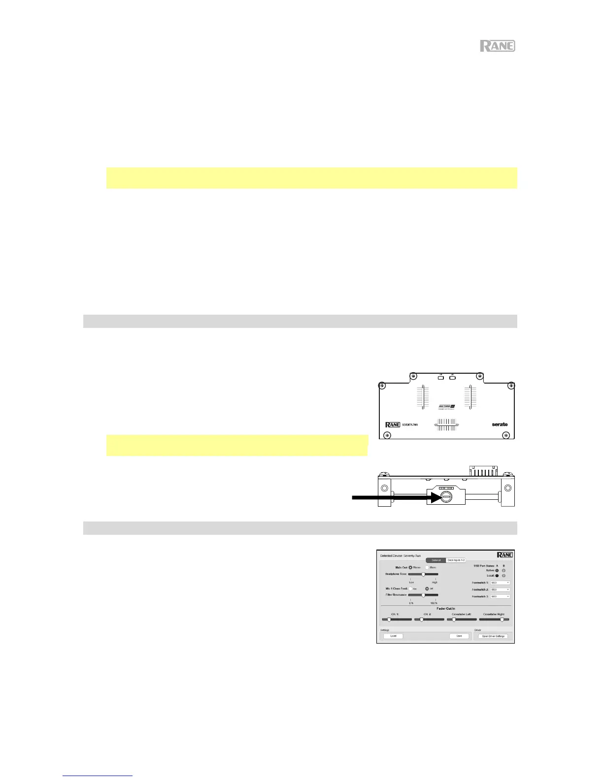 sección Settings (Ajustes) del panel de control de Rane, debajo de la