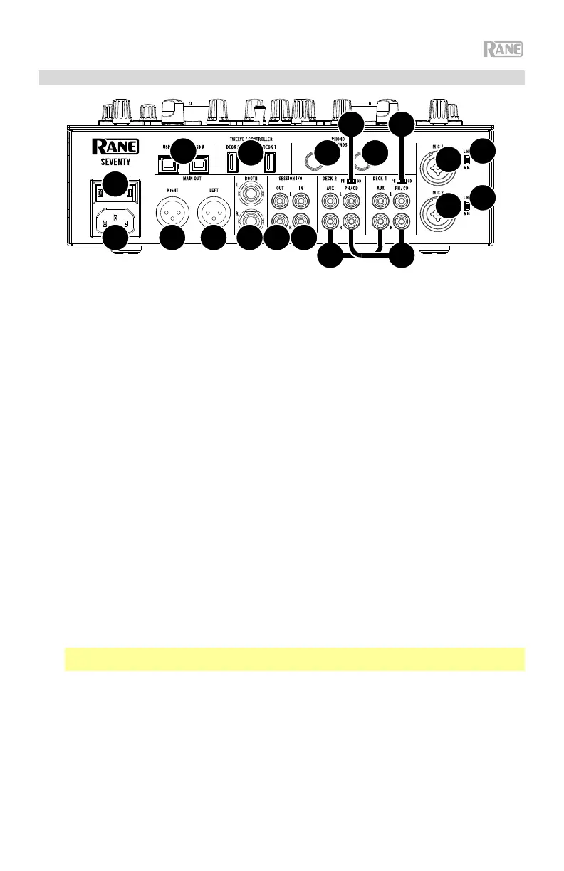 1. Entrada de alimentación: Con el Seventy apagado, conecte el cable de alimentación incluido a esta