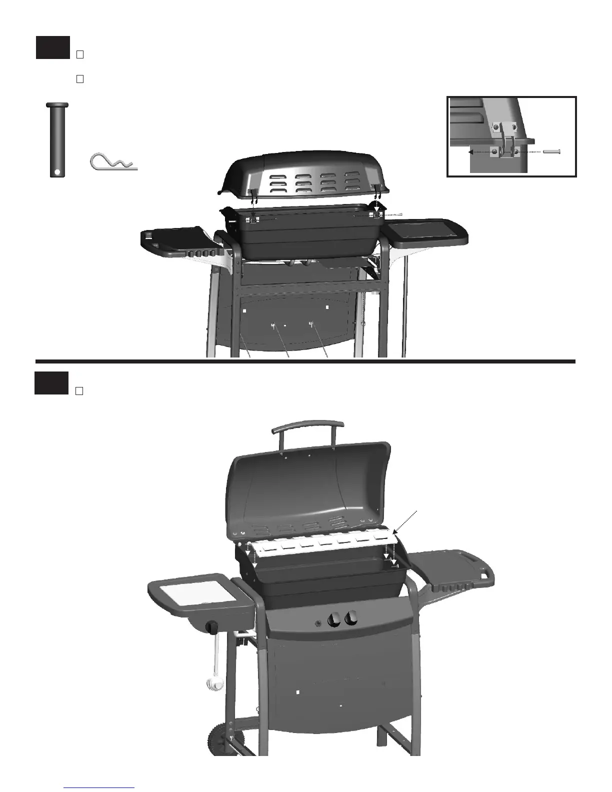 Place lid assembly onto firebox, aligning hinges. Hinges on lid fit inside hinges on firebox. Secure using two hinge pins
