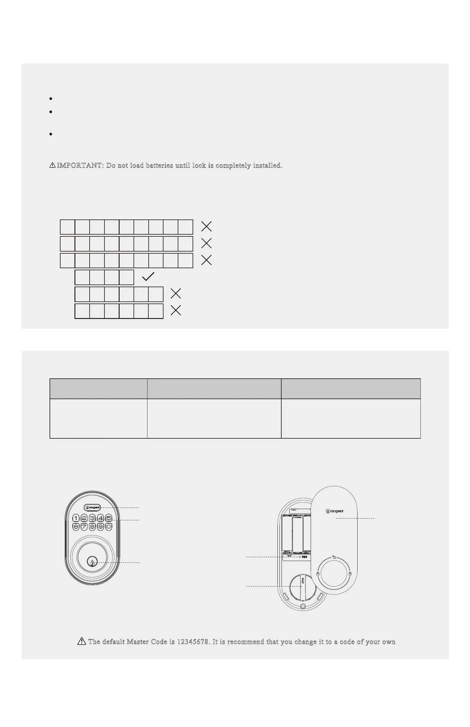 1. Master Code(4 to 10 digits) : The default Master Code is 12345678. It is recommended that you change it to a code of