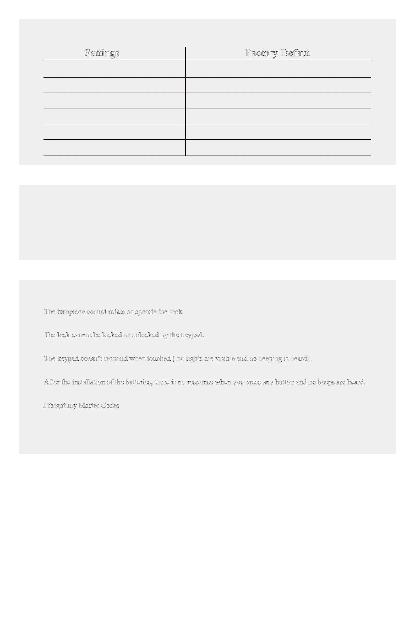 Make sure that the codes are not disabled. If needed, restore the lock’s default settings.