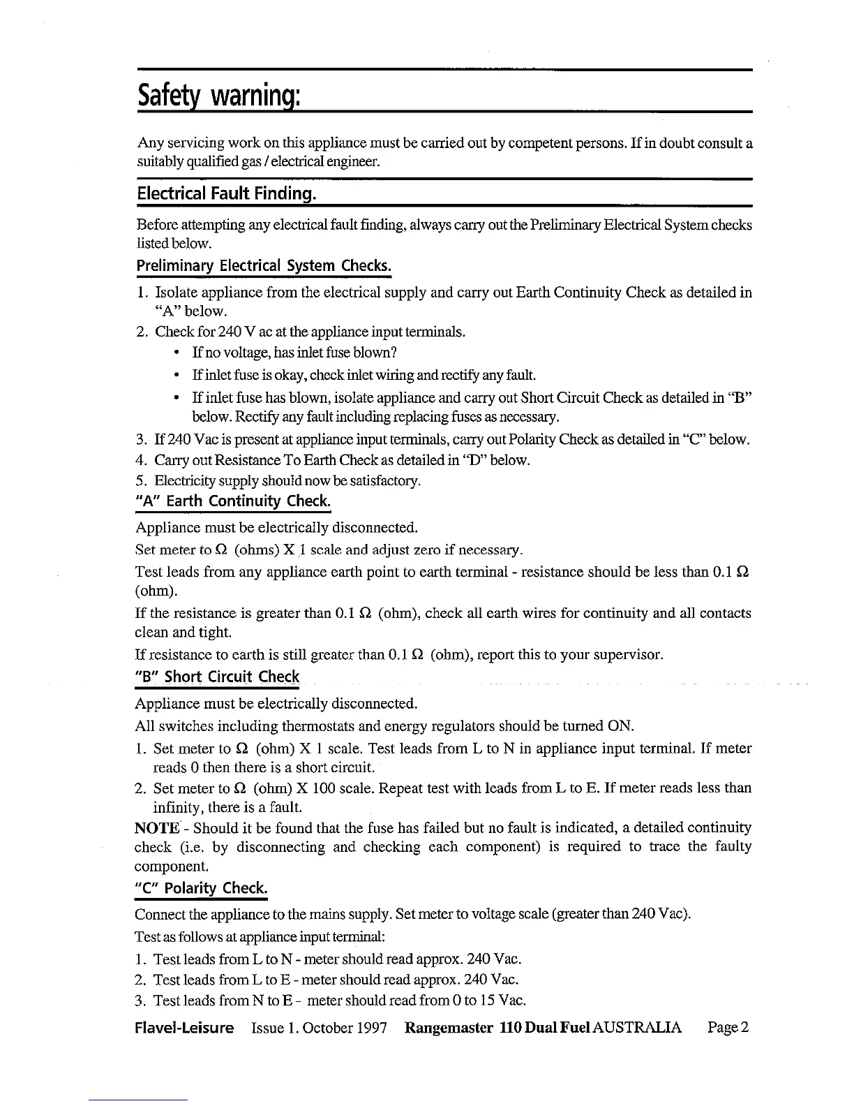 Rangemaster 110 leisure - Safety Warning; Electrical Fault Finding