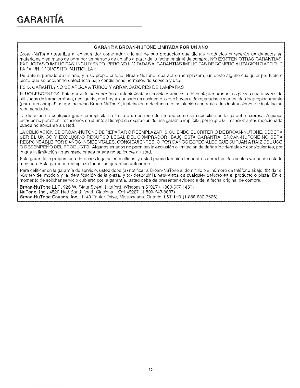 SER EL UNICO Y EXCLUSIVO RECURSO LEGAL DEL COMPRADOR BAJO ESTA GARANTIA. BROAN-NUTONE NO SERA