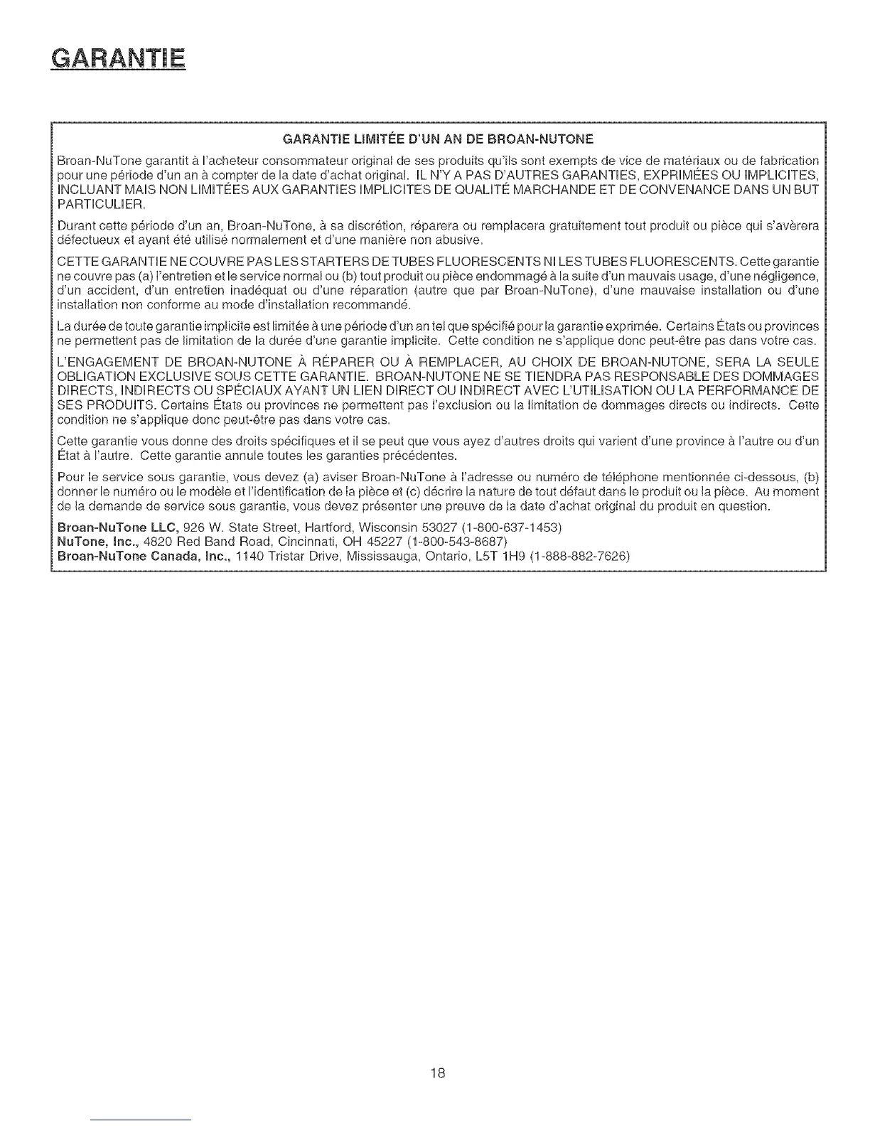 OBLiGATiON EXCLUSIVE SOUS CETTE GARANTIE. BROAN-NUTONE NE SE TIENDRA PAS RESPONSABLE DES DOMMAGES