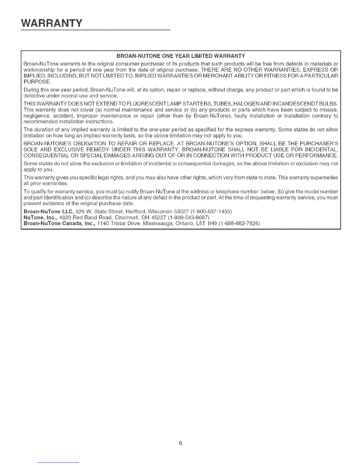 SOLE AND EXCLUSIVE REMEDY UNDER THiS WARRANTY. BROAN-NUTONE SHALL NOT BE LIABLE FOR iNCiDENTAL,