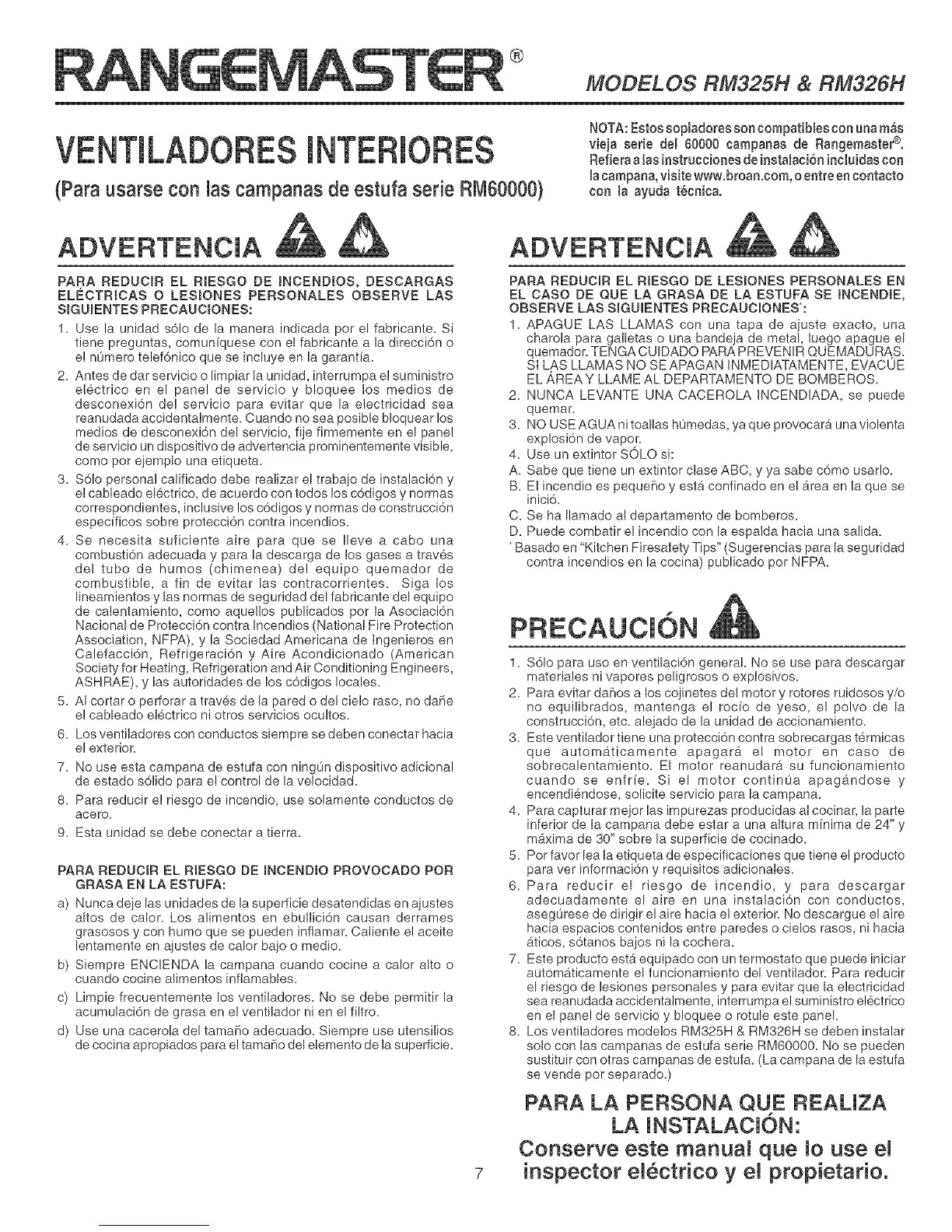 8. Los ventiladores mode!os RM325H & RM326H se deben instalar