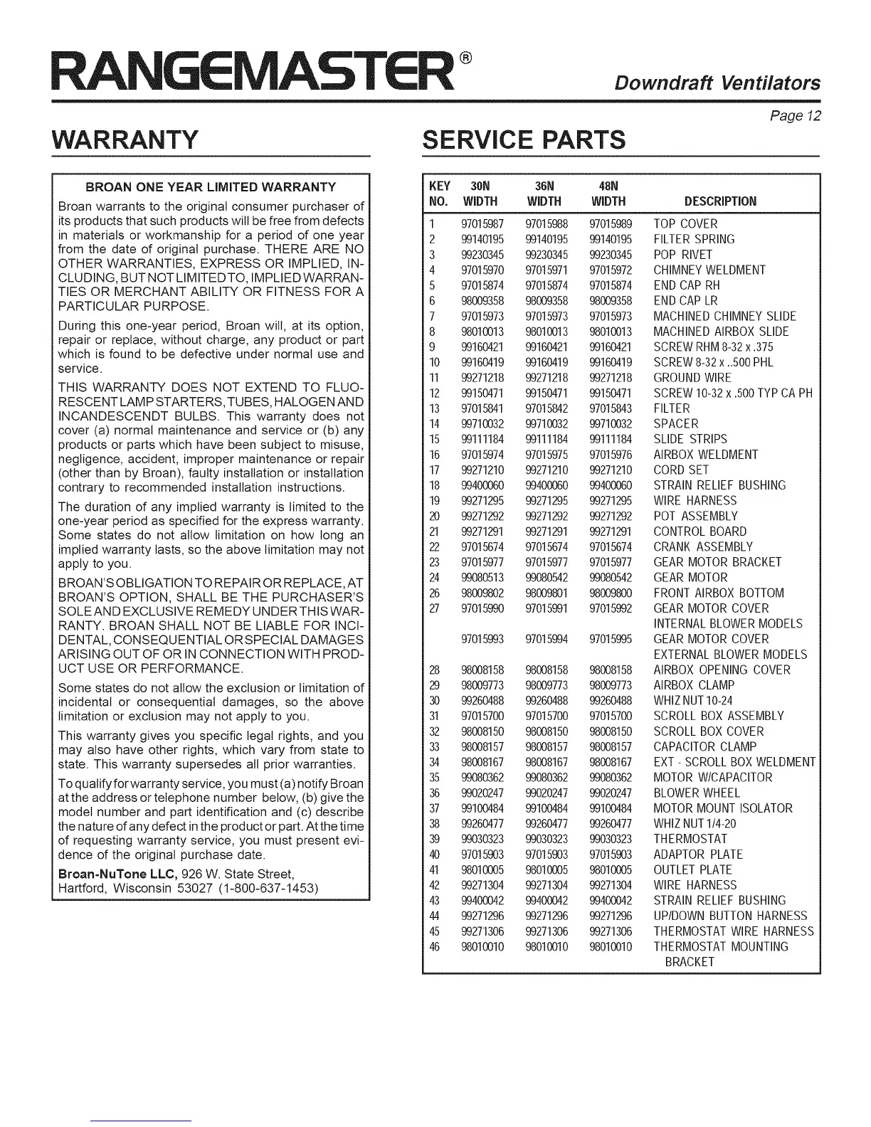 RANTY. BROAN SHALL NOT BE LIABLE FOR INCI-