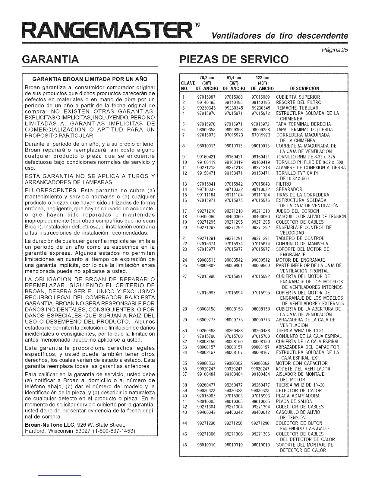 Broan reparara o reemplazara, sin costo alguno