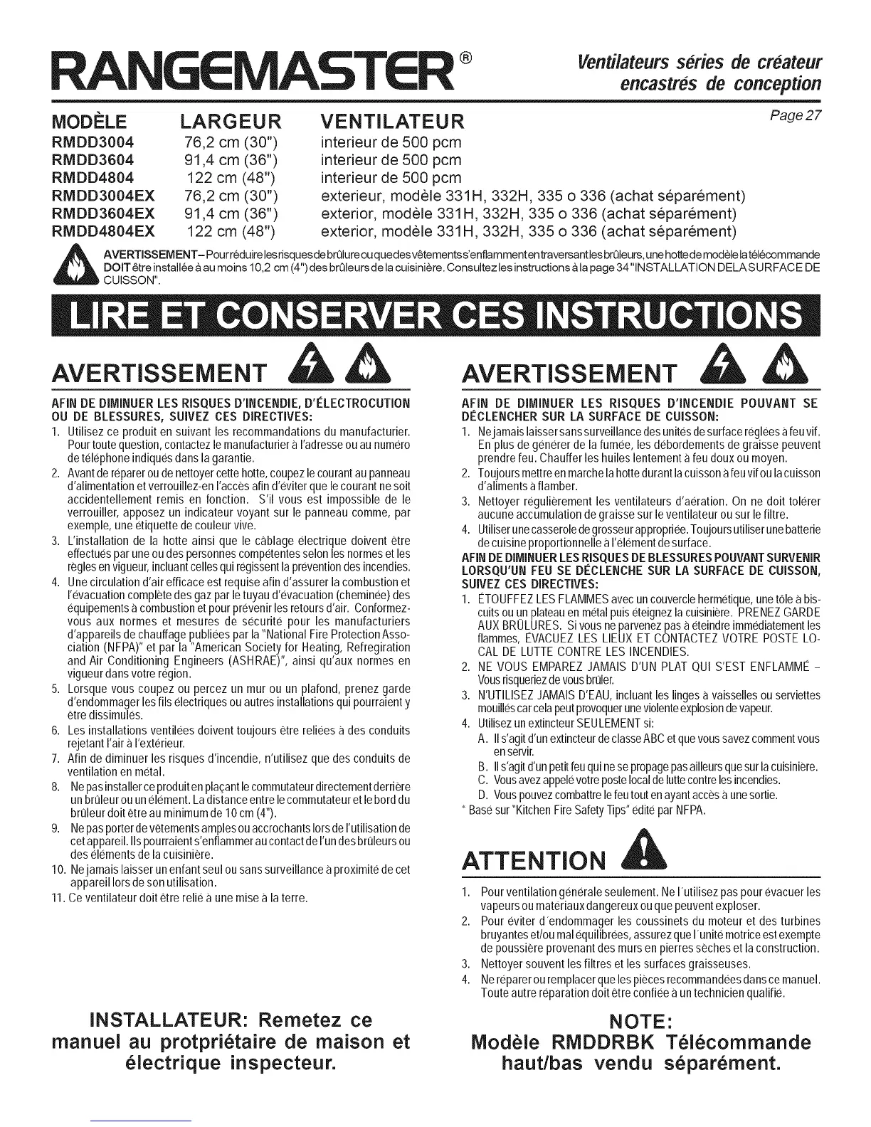 _ AVERTISSEMENT- Pourr6duireles risquesde brQlureou quedesv_tementss'enflammenten traversantles bn31eurs,une hottede modelela t616commande