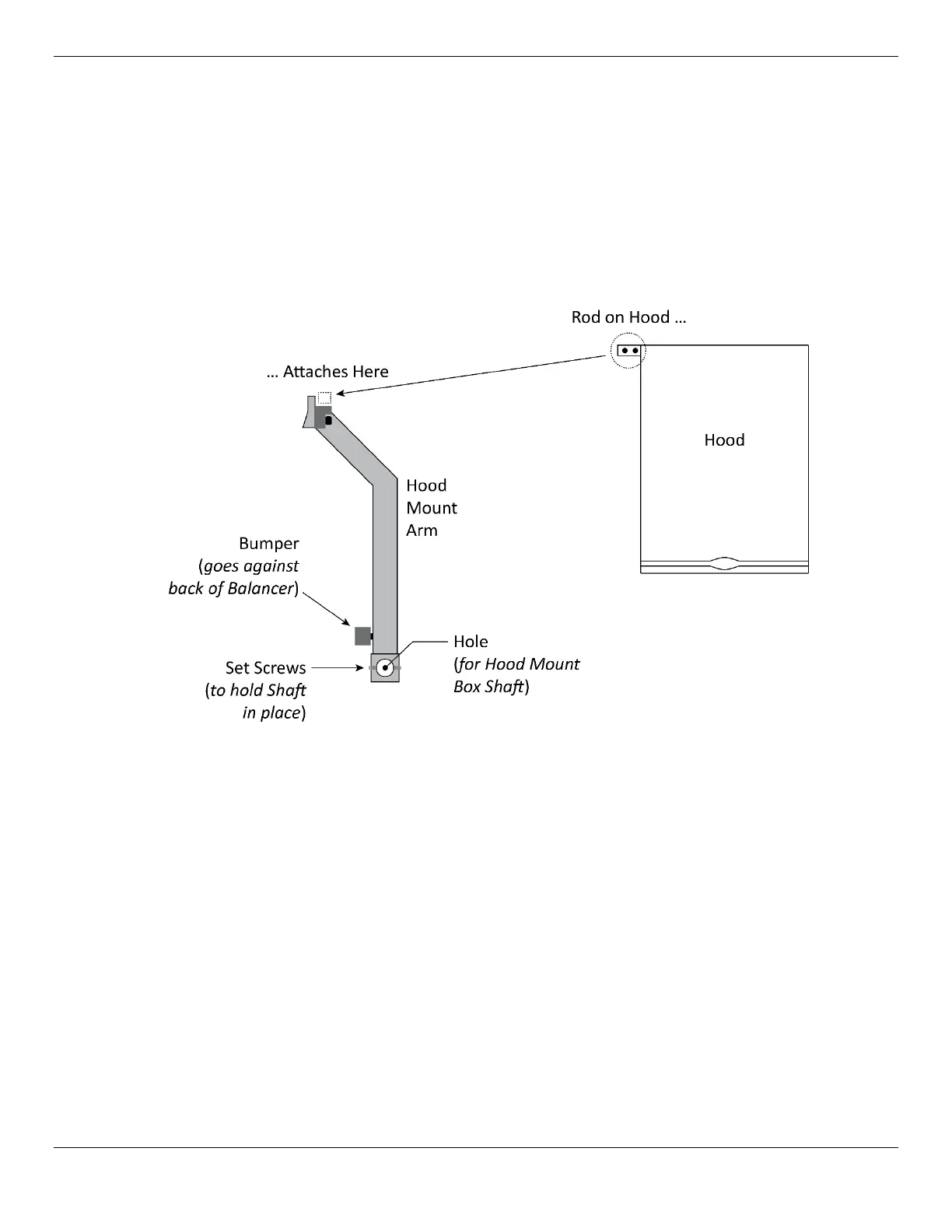 8. Align the Set Screws on the bottom of the Hood Mount Arm with the Grooves in the Shaft, then