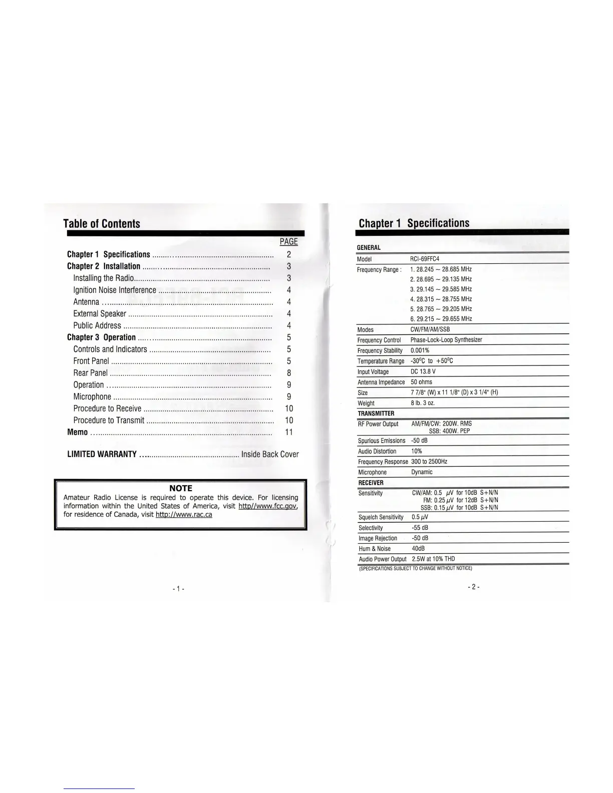 Ranger RCI-69FFC4 - Chapter 1 Specifications; General Specifications; Transmitter Specifications; Receiver Specifications