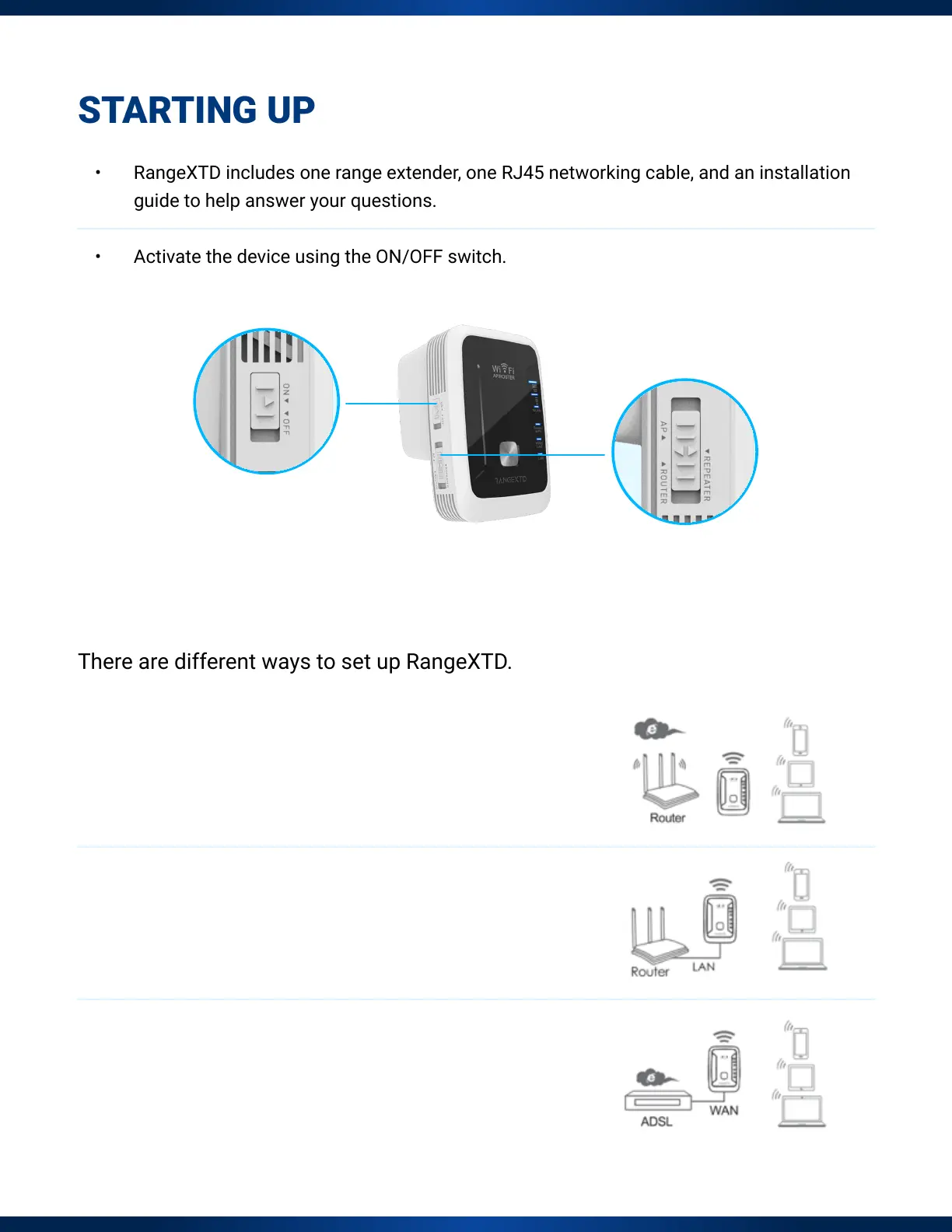 • RangeXTD includes one range extender, one RJ45 networking cable, and an installation