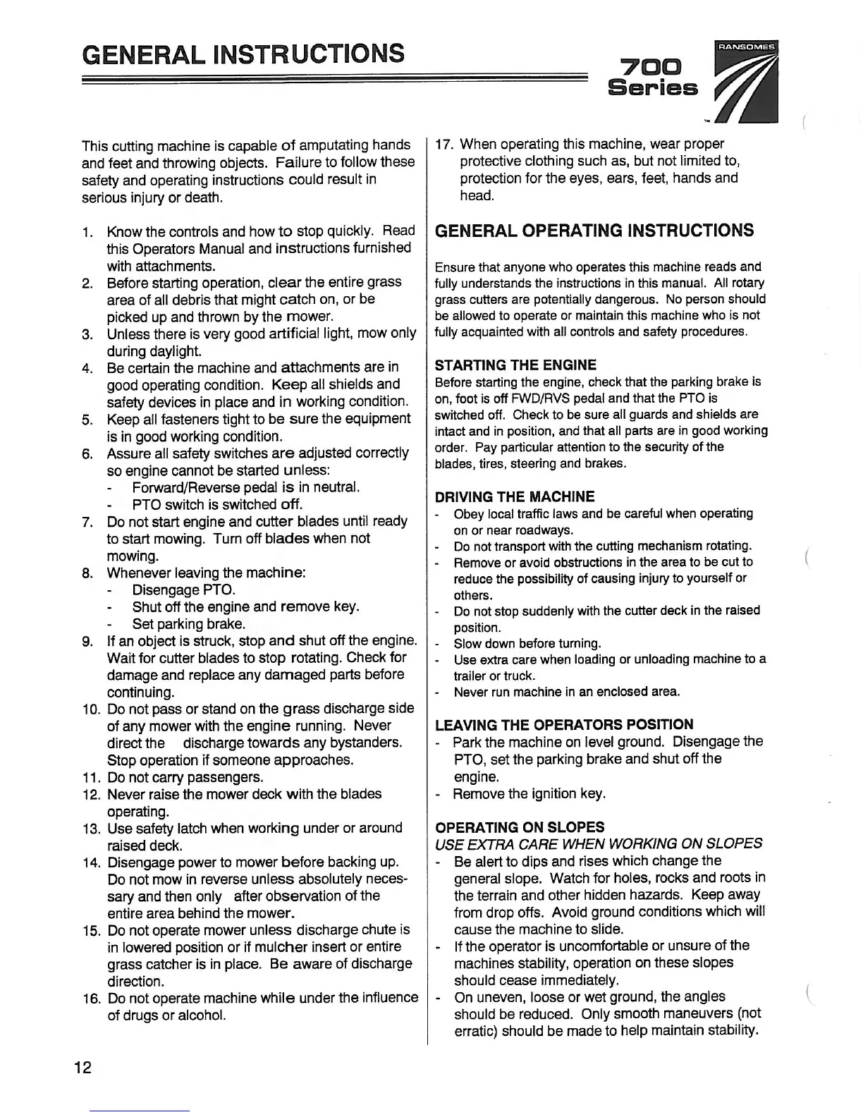 Ransomes 946700 - GENERAL INSTRUCTIONS; OPERATING PROCEDURES AND SAFETY; OPERATING ON SLOPES