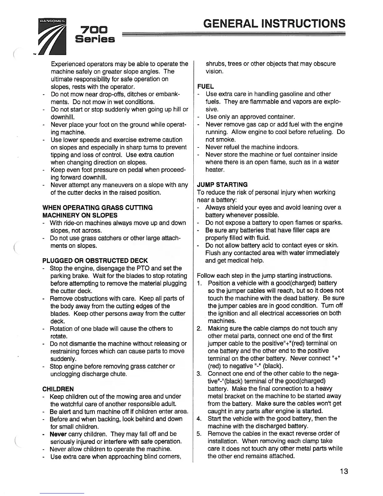 Ransomes 946700 - When Operating Grass Cutting Machinery on Slopes; Fuel; Jump Starting; Plugged or Obstructed Deck