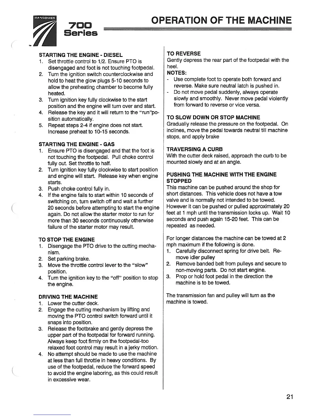 Ransomes 946700 - OPERATION OF THE MACHINE; STARTING AND STOPPING ENGINES; DRIVING AND MANEUVERING TECHNIQUES