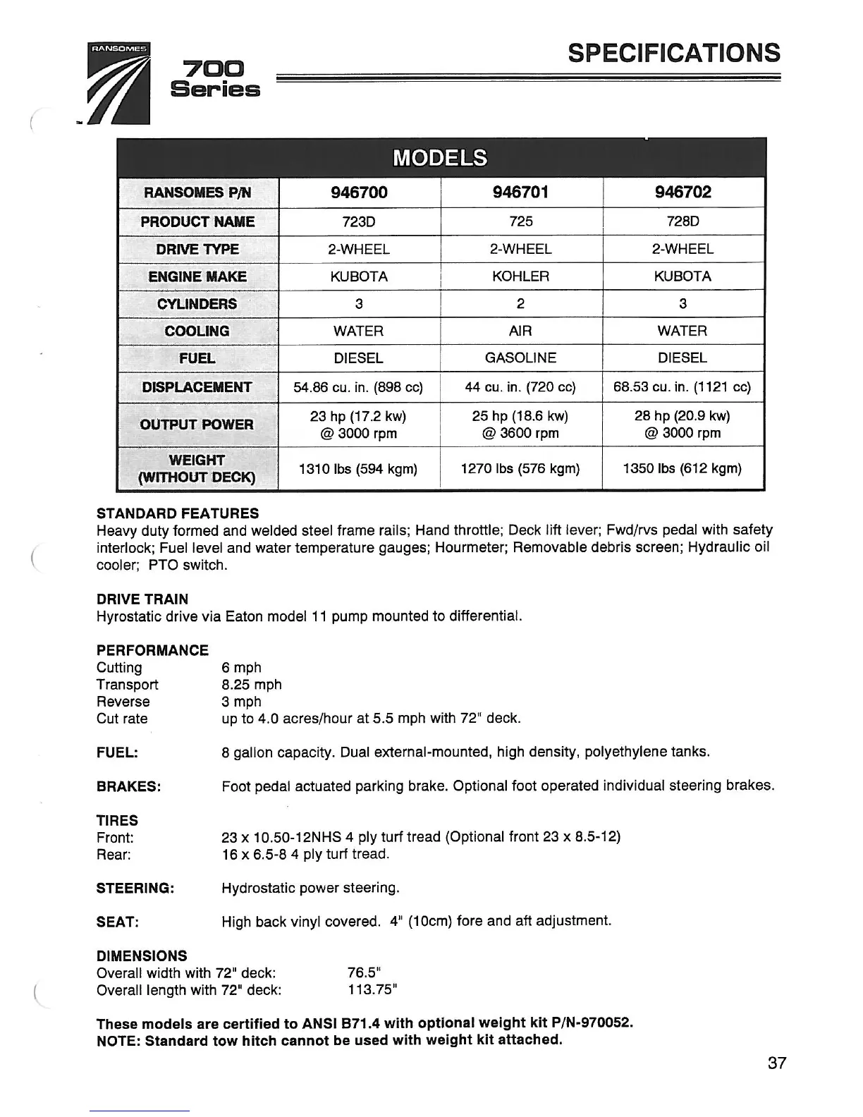 Ransomes 946700 - Specifications; Standard Features; Drive Train; Performance