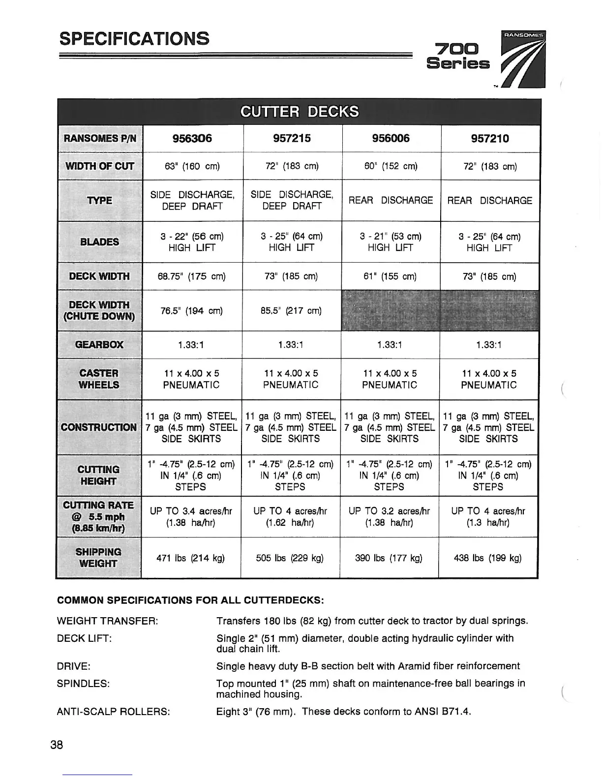 Ransomes 946700 - Cutter Decks; Common Specifications for All Cutterdecks
