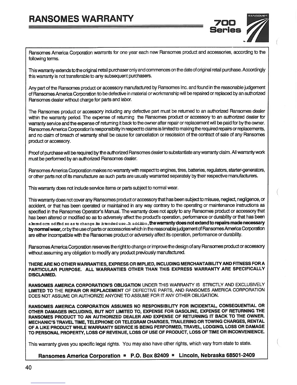 Ransomes 946700 - RANSOMES WARRANTY