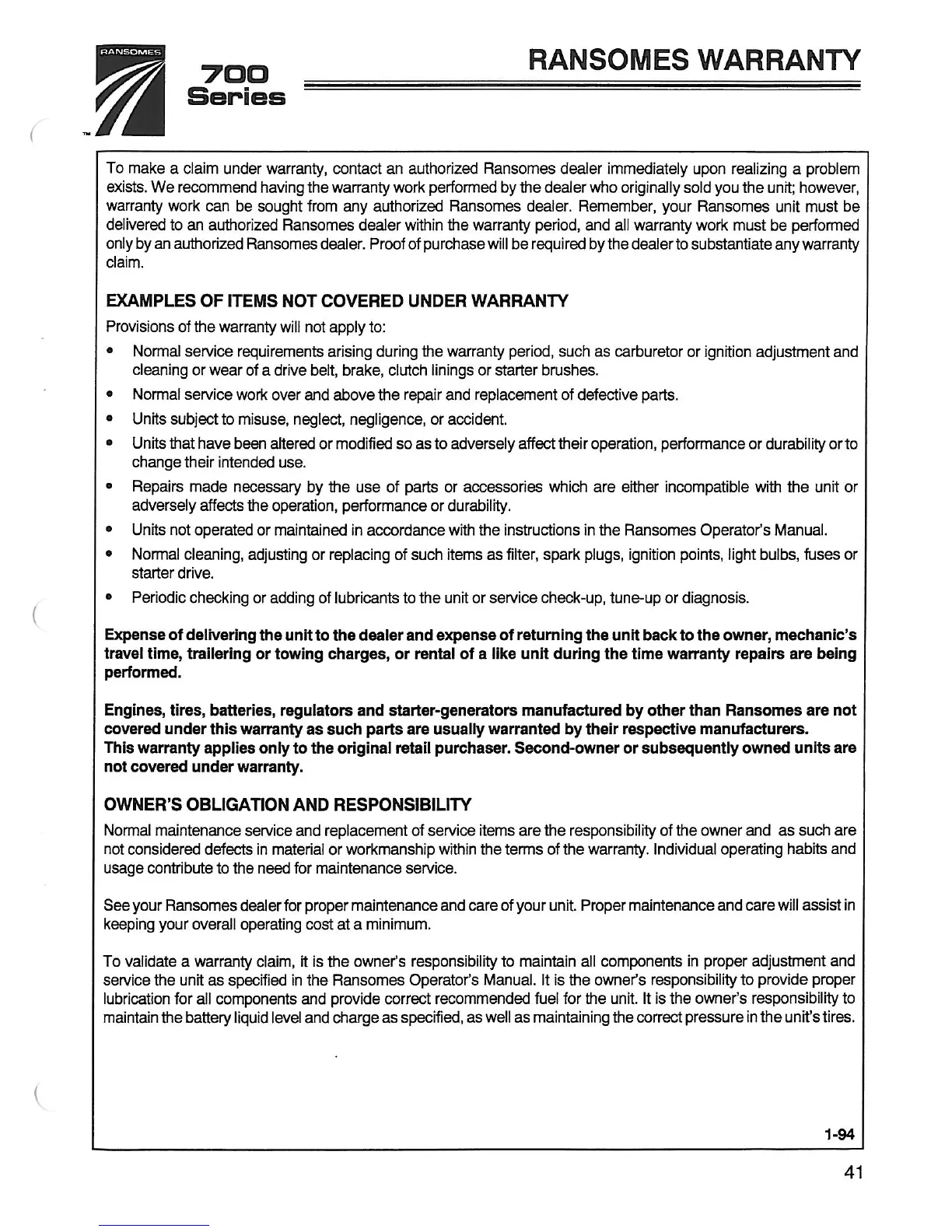 Ransomes 946700 - WARRANTY TERMS AND EXCLUSIONS; OWNERS MAINTENANCE RESPONSIBILITIES