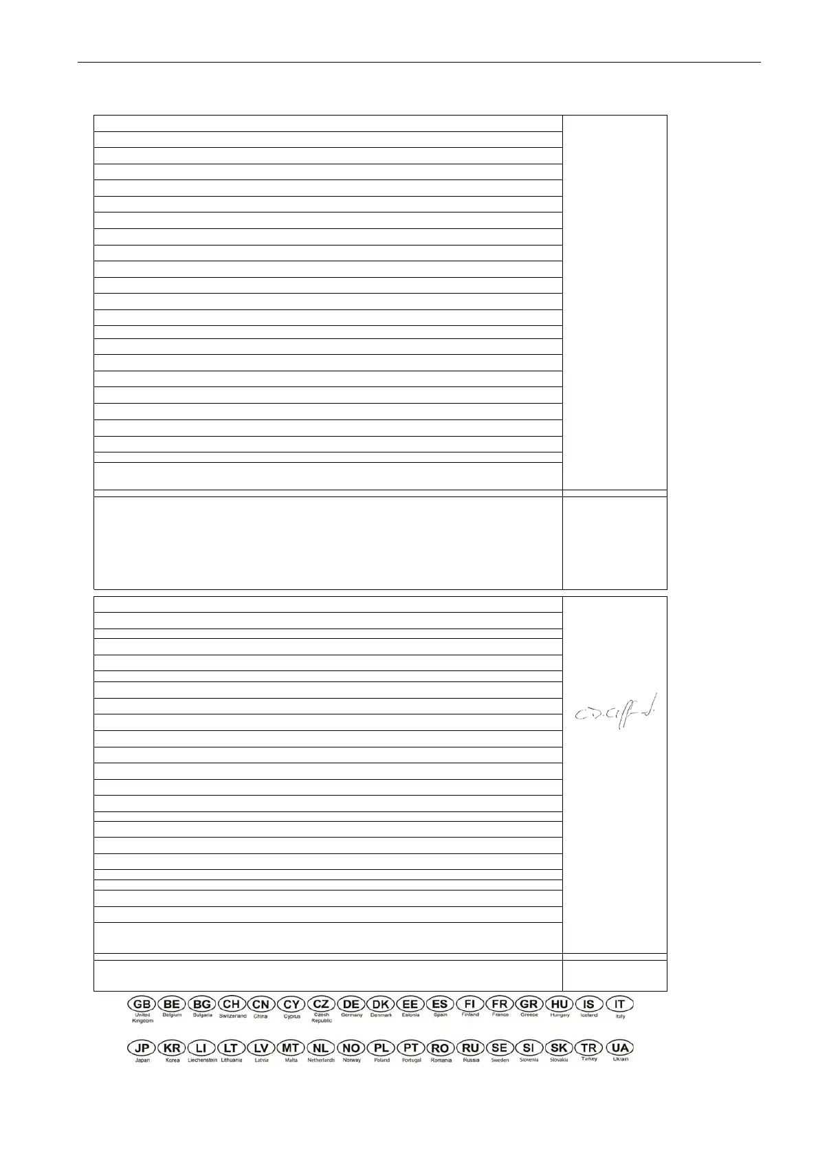 Undirskrift aðilans sem hefur umboð til að gera yfirlýsinguna fyrir hönd framleiðandans, hefur undir höndum tæknigögnin og hefur leyfi til að taka saman tækniskýrsluna, og er viðurkenndur innan