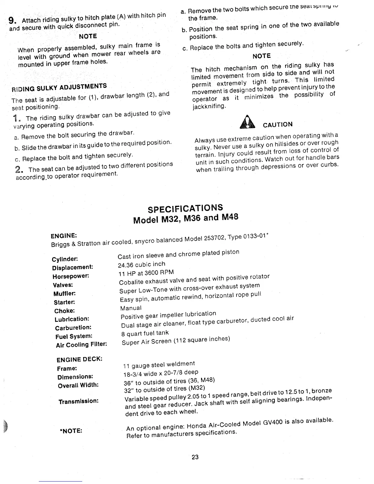 Ransomes M32 - Riding Sulky Adjustments; Specifications