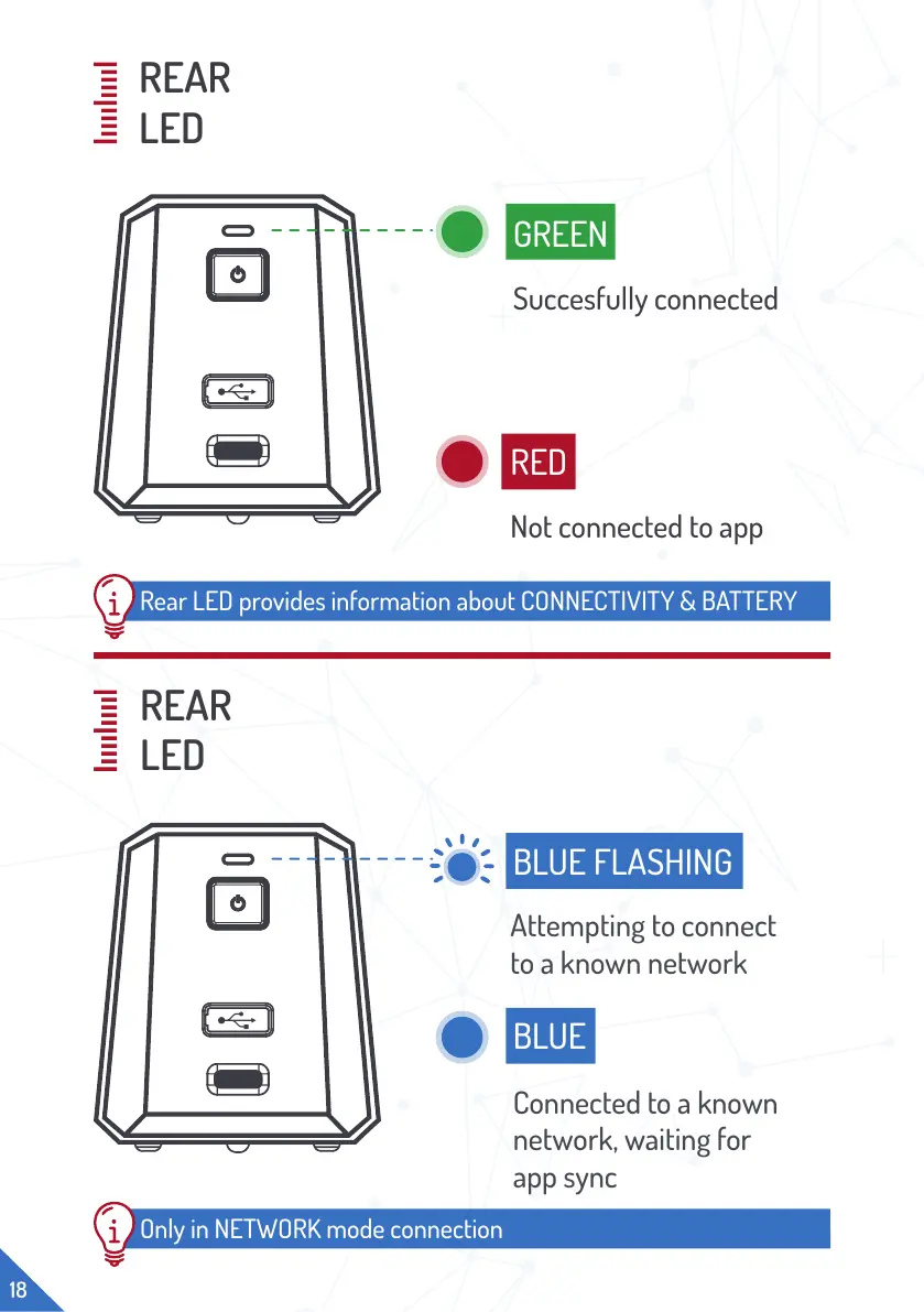 Rear LED provides information about CONNECTIVITY & BATTERY