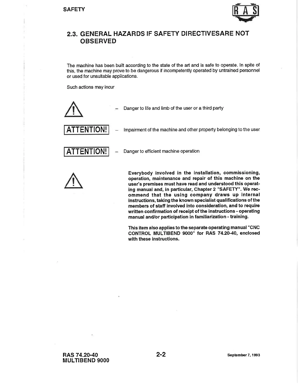 RAS MULTIBEND 9000 - 2.3 General Hazards If Safety Directives Are Not Observed