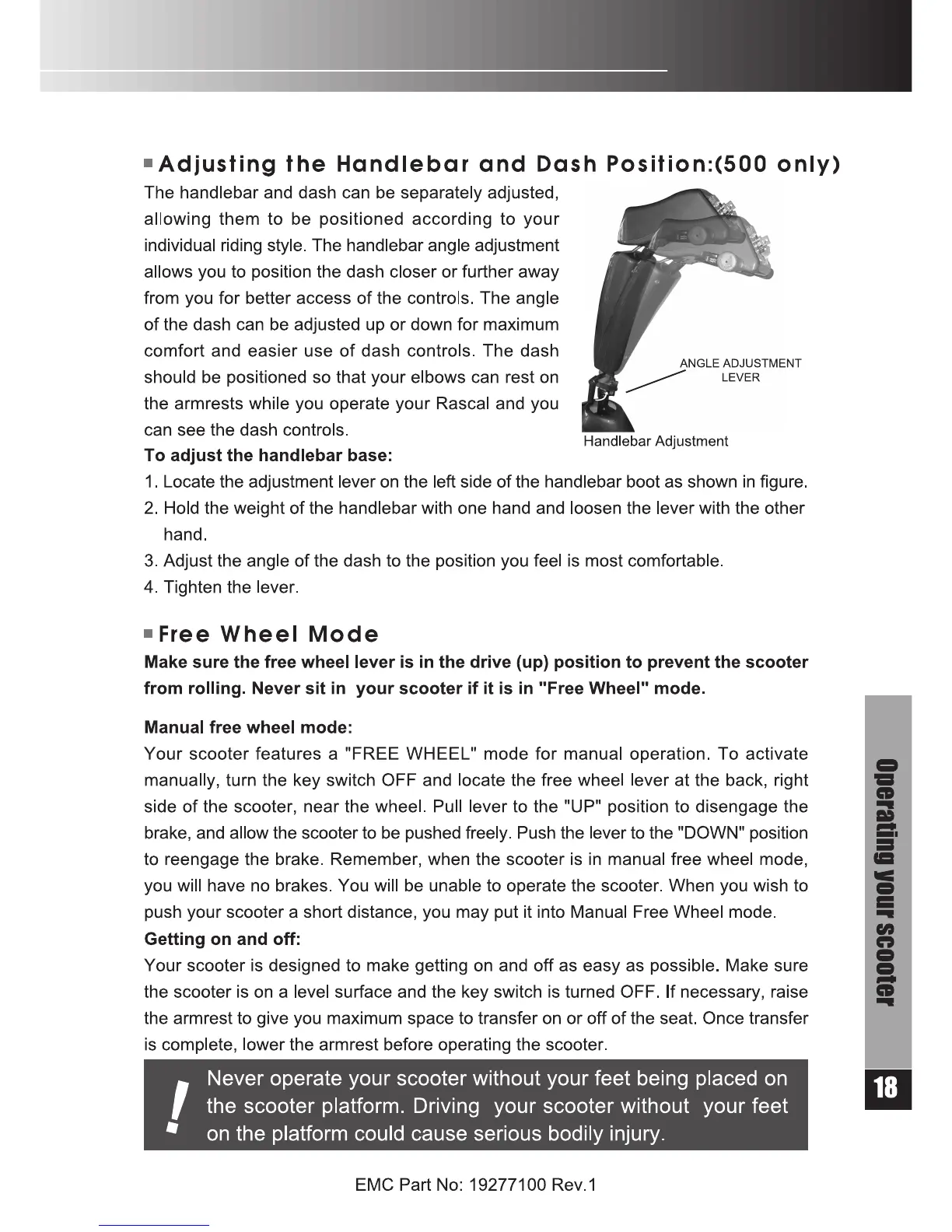 Rascal R200 Series - Handlebar and Dash Adjustment (Model 500); Handlebar Angle Adjustment; Free Wheel Mode Operation; Engaging Free Wheel Mode