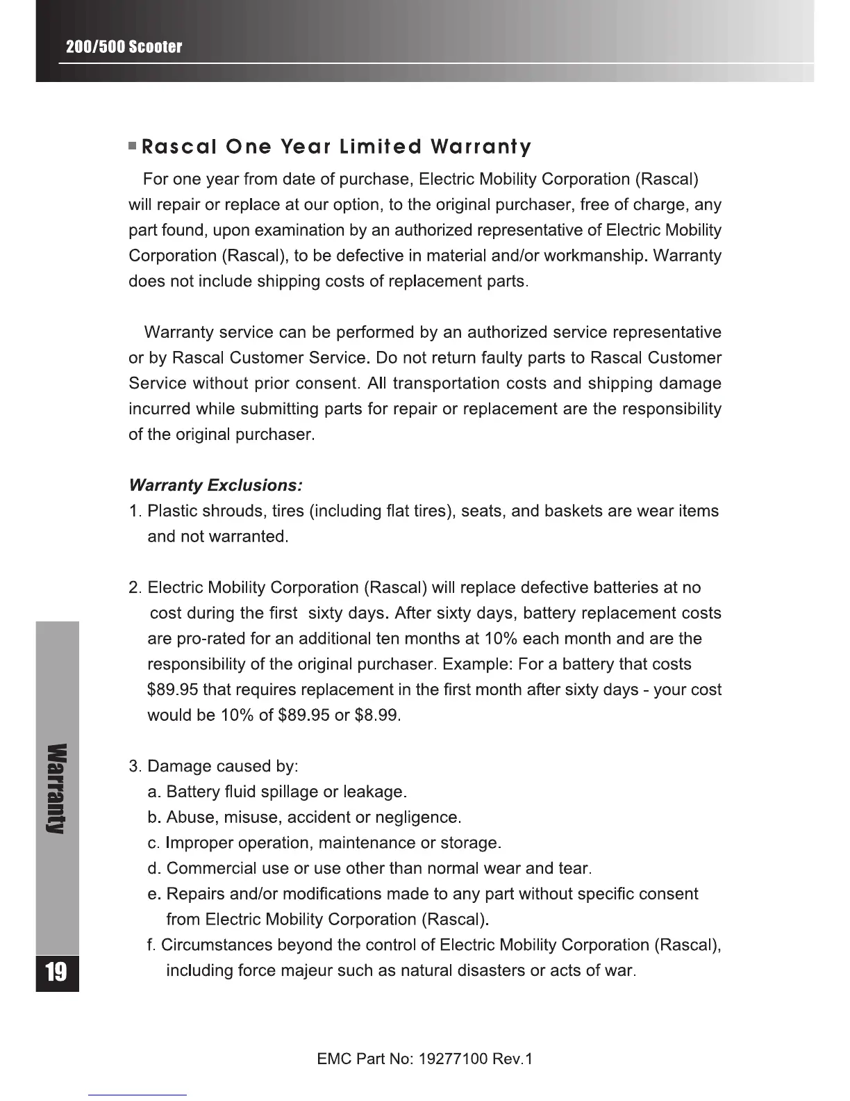 Rascal R200 Series - Rascal One Year Limited Warranty; Warranty Coverage and Service; Exclusions: Wear Items and Batteries; Exclusions: Damage and Modifications