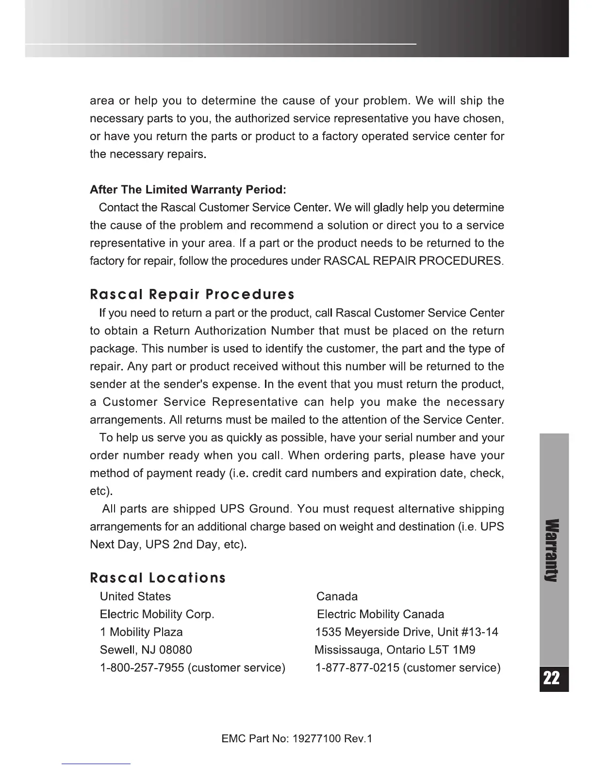 Rascal R200 Series - Rascal Service Locations and Procedures; Contacting Customer Service and Repair; Repair Return Procedures; Service Locations