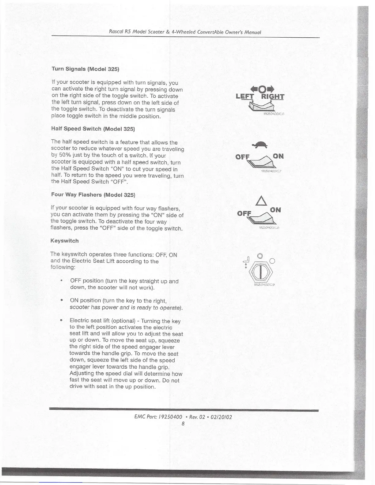 Rascal R205 - Scooter Control Features; Turn Signals (Model 325); Half Speed Switch (Model 325); Four Way Flashers (Model 325)