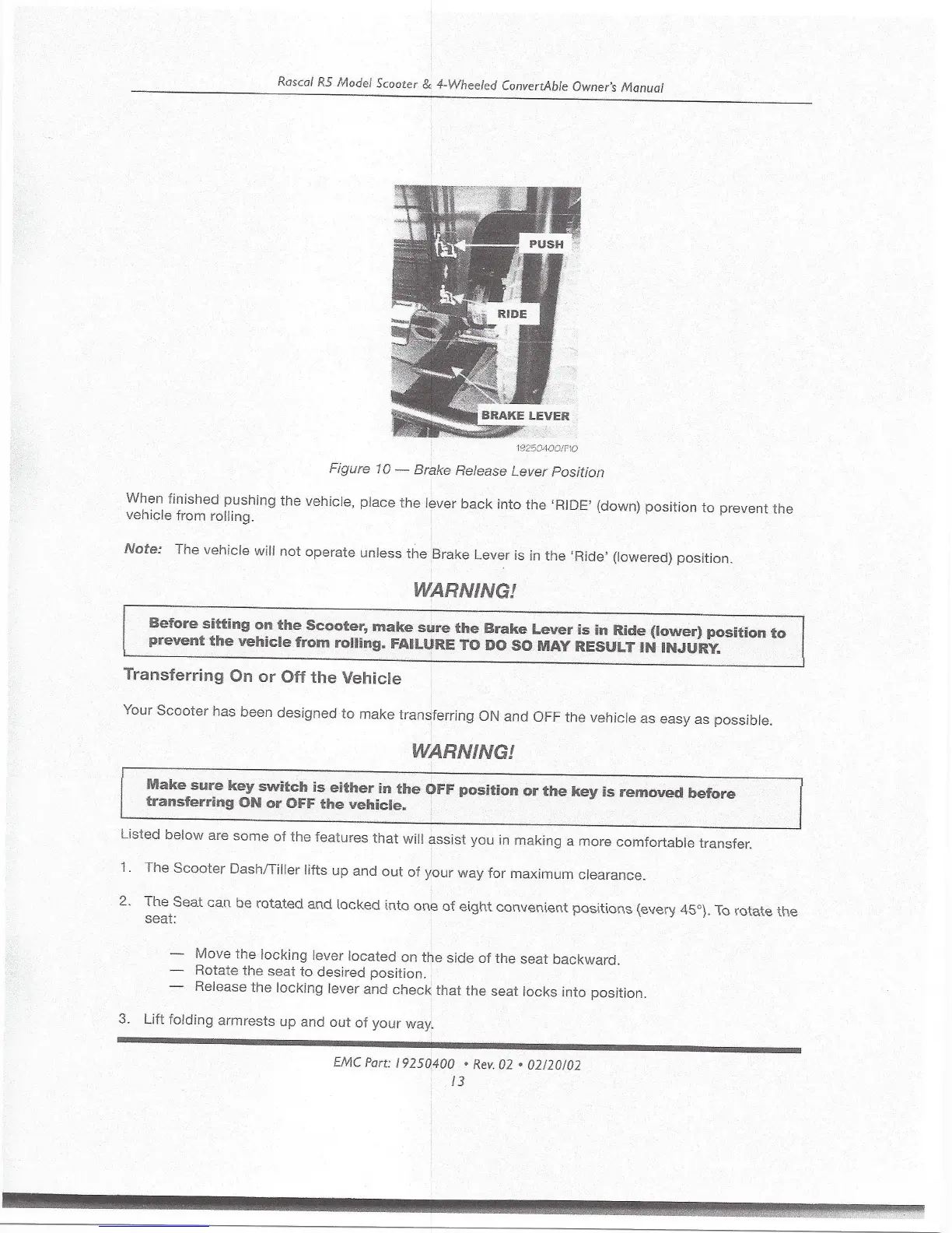 Rascal R205 - Manually Pushing the Vehicle; Transferring On or Off the Vehicle