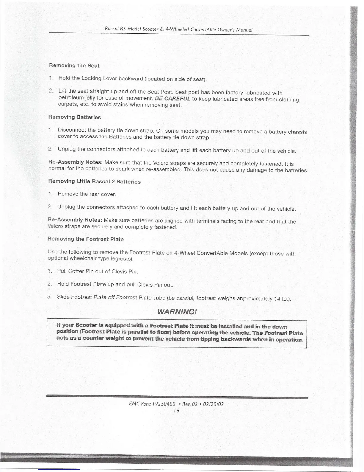 Rascal R205 - Seat Removal; Battery Removal; Little Rascal 2 Battery Removal; Footrest Plate Removal