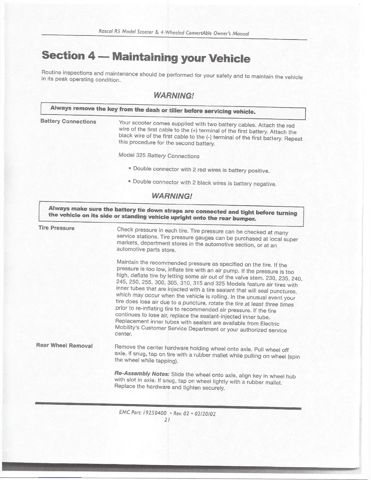 Rascal R205 - Maintaining Your Vehicle; Battery Connections; Tire Pressure Maintenance; Rear Wheel Removal